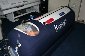 HBOT is authorized by the FDA for many problems and these small chambers seem very safe (whereas large chambers are quite technical in operation and also involve 100% O2 which presents many safety problems). So, more to come later today as Jim tries HBOT for the first time and we'll take some photos.